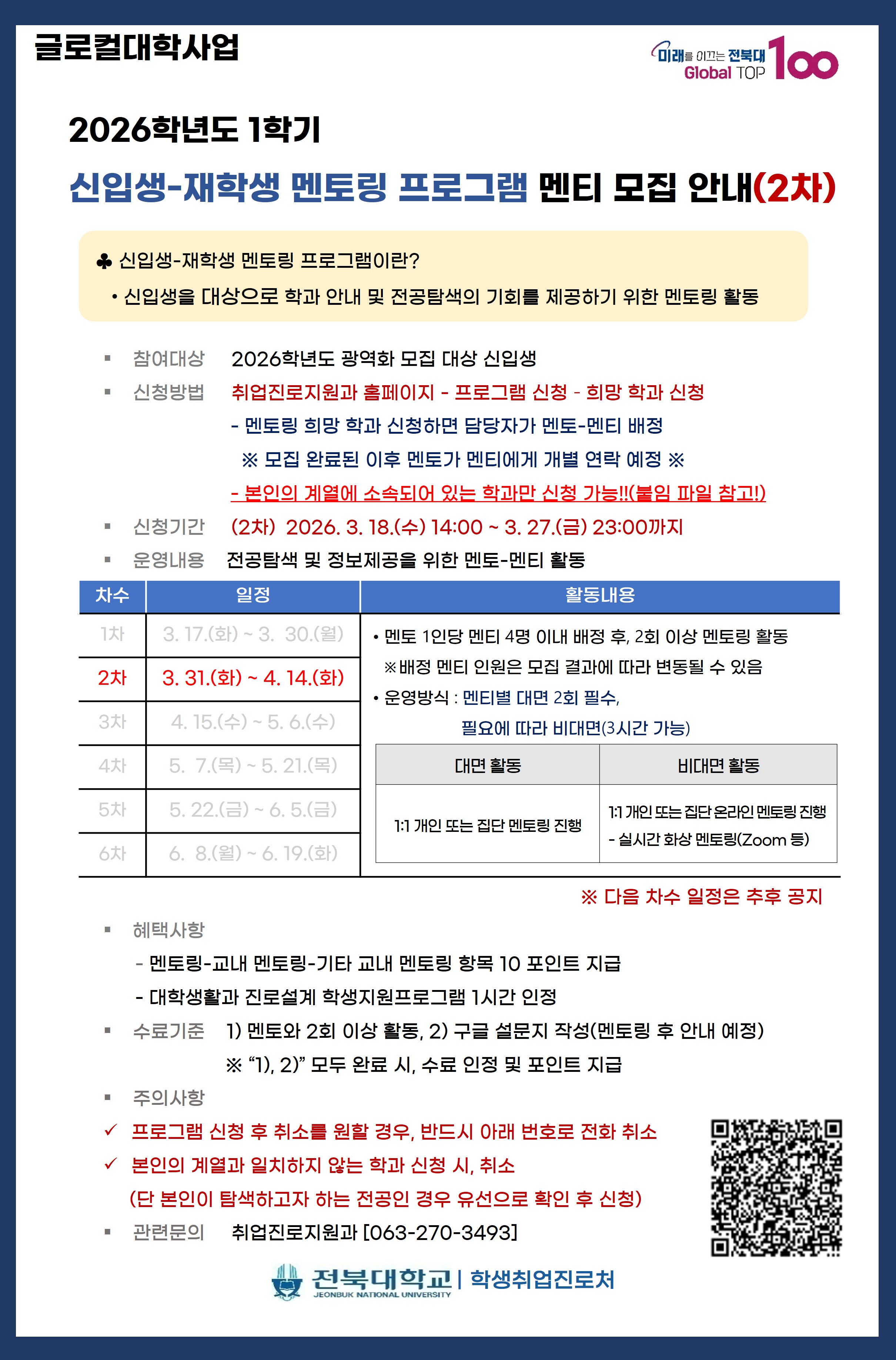글로컬대학사업의 일환으로, 신입생 모집단위 광역화에 따른 학생 전공 선택권 보장 및 전공 탐색 기회를 제공하기 위한「2026학년도 신입생-재학생 멘토링 프로그램」을 아래와 같이 운영하오니, 해당 학생들이 참여하시기