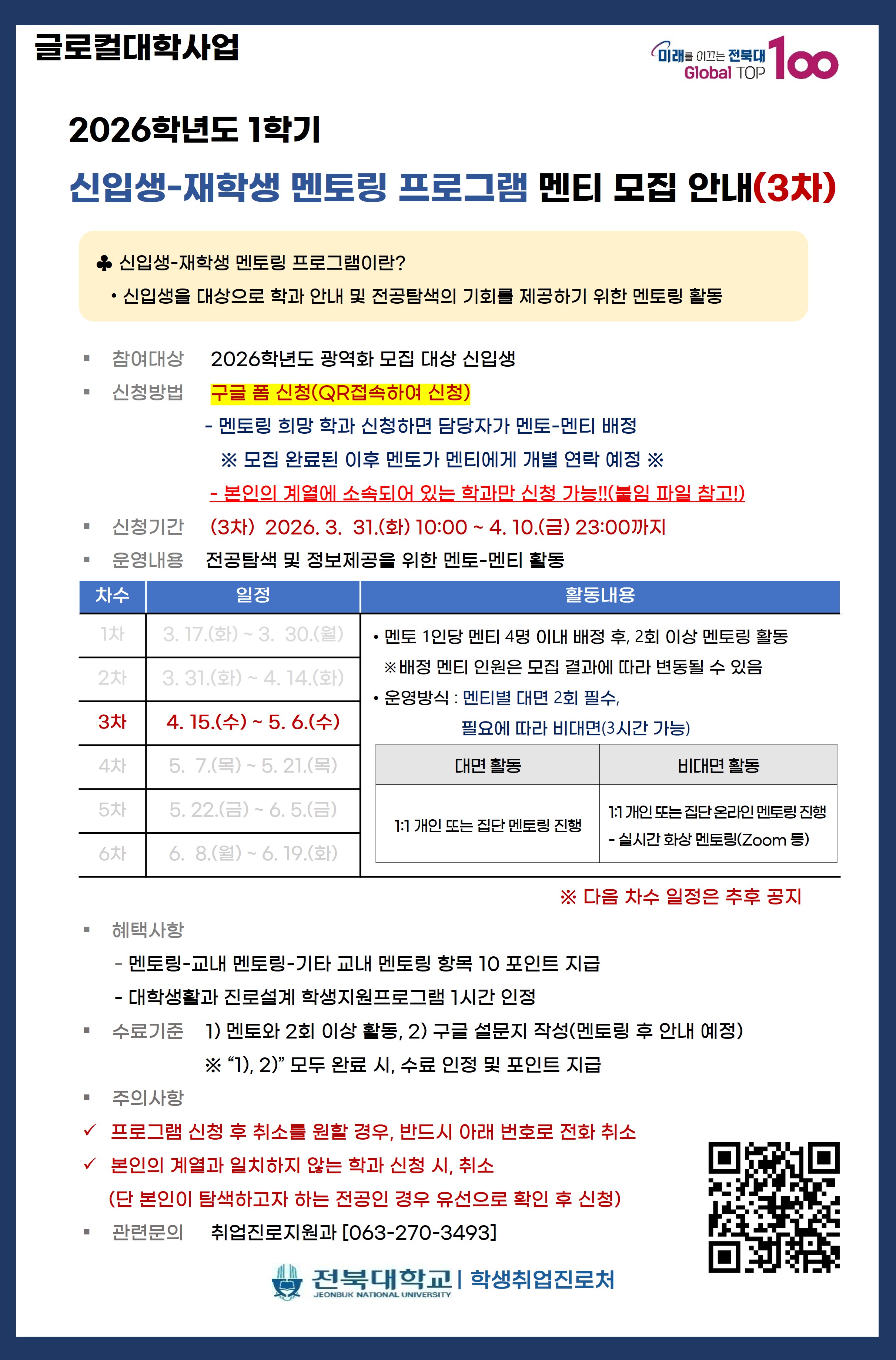 [1학년, 계열입학자 해당] 2026학년도 신입생-재학생 멘토링 프로그램 멘티 모집(3차)
