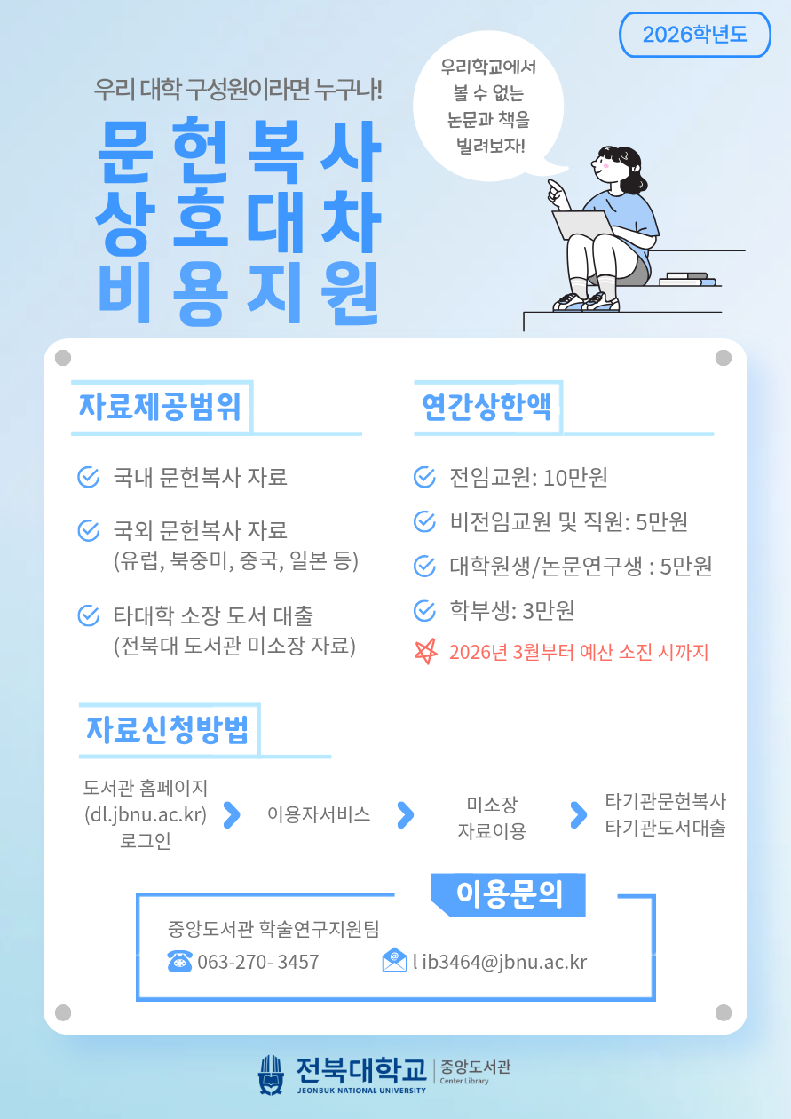 fnctId=bbs,fnctNo=4926 작성일 2026.04.01 수정일 2026.04.01 작성자 컴퓨터인공지능학부 조회수 18 2026학년도 문헌복사 및 상호대차 비용지원 서비스 이용 안내 첨부파일 타기관 문헌복사신청서.xlsx